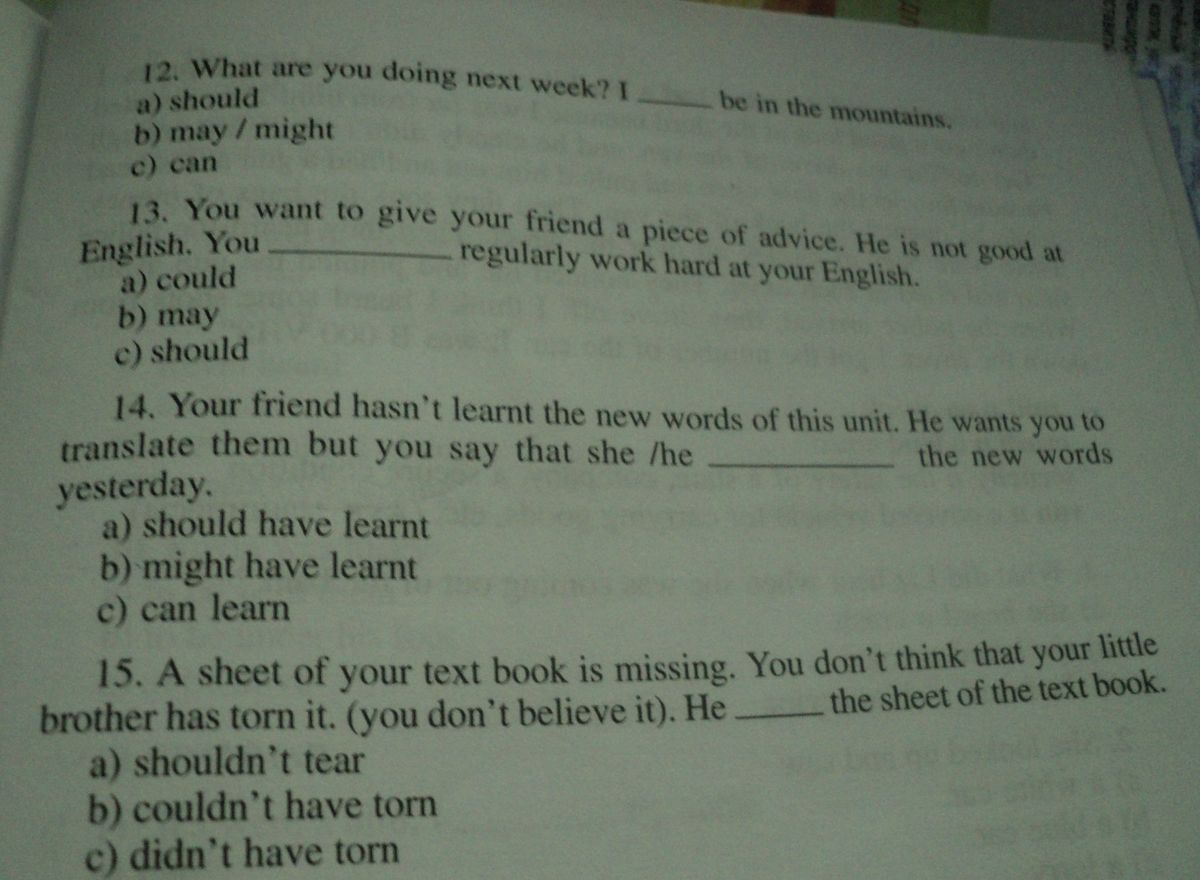 15. Потерялся листок из твоего учебника. Ты не думаешь, что твой младший брат порвал его(ты этому не веришь). Он не мог порвать листок из учебника. Ответ: b
