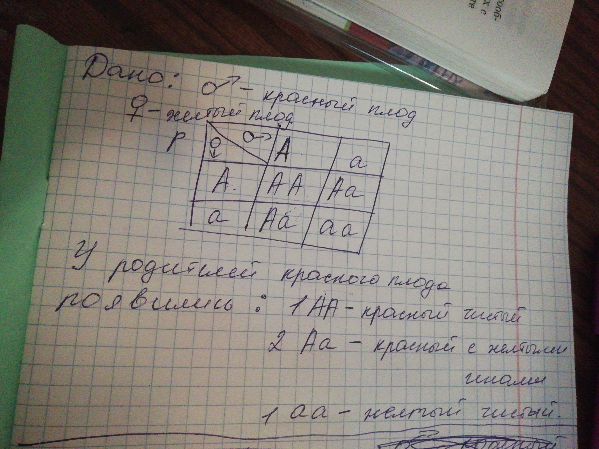 Родители красного плода были гетерозиготами, т.е. Красными с жёлтыми генами