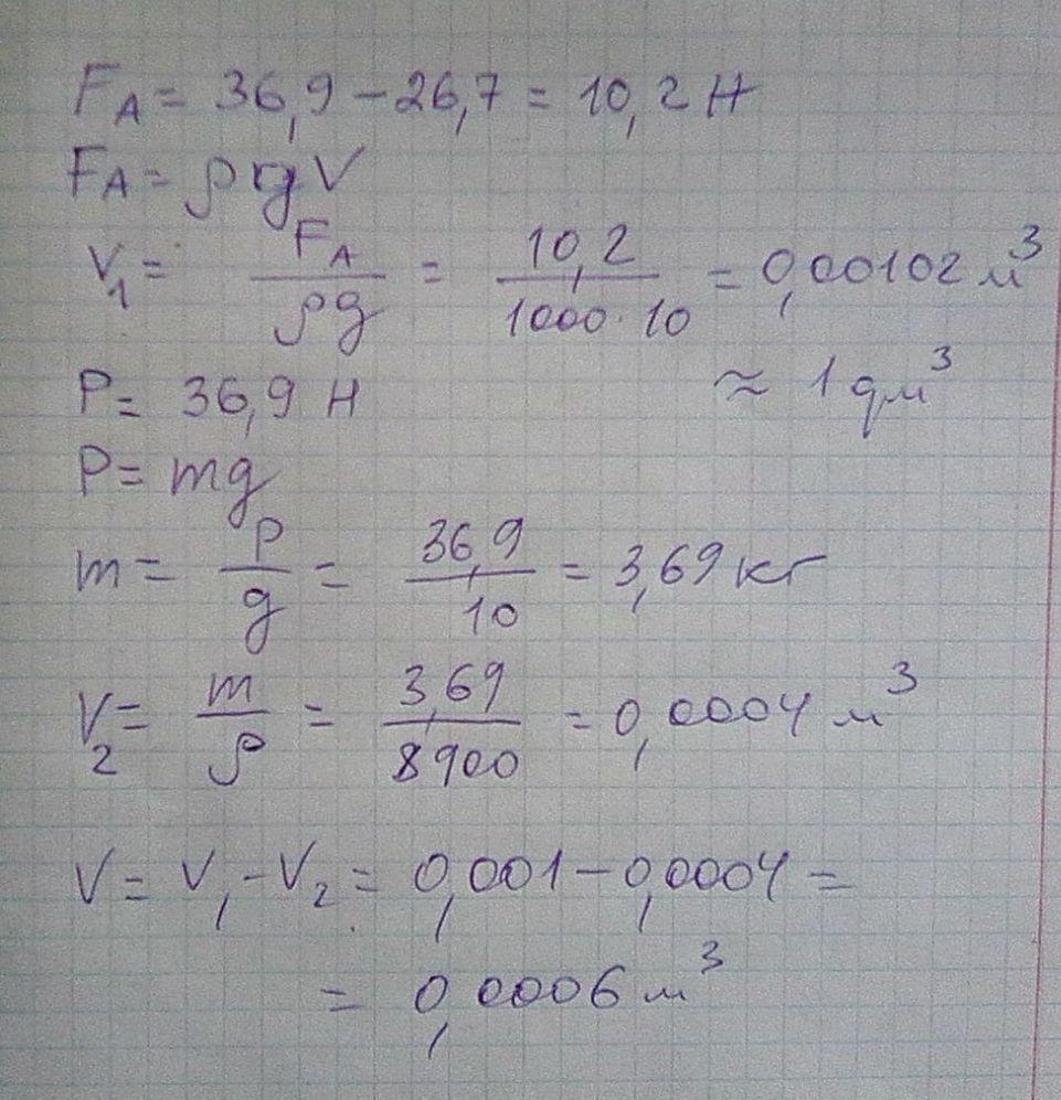 V' = F/ρ(Cu)g = 36,9/8900*10 = 0,0004 м³.