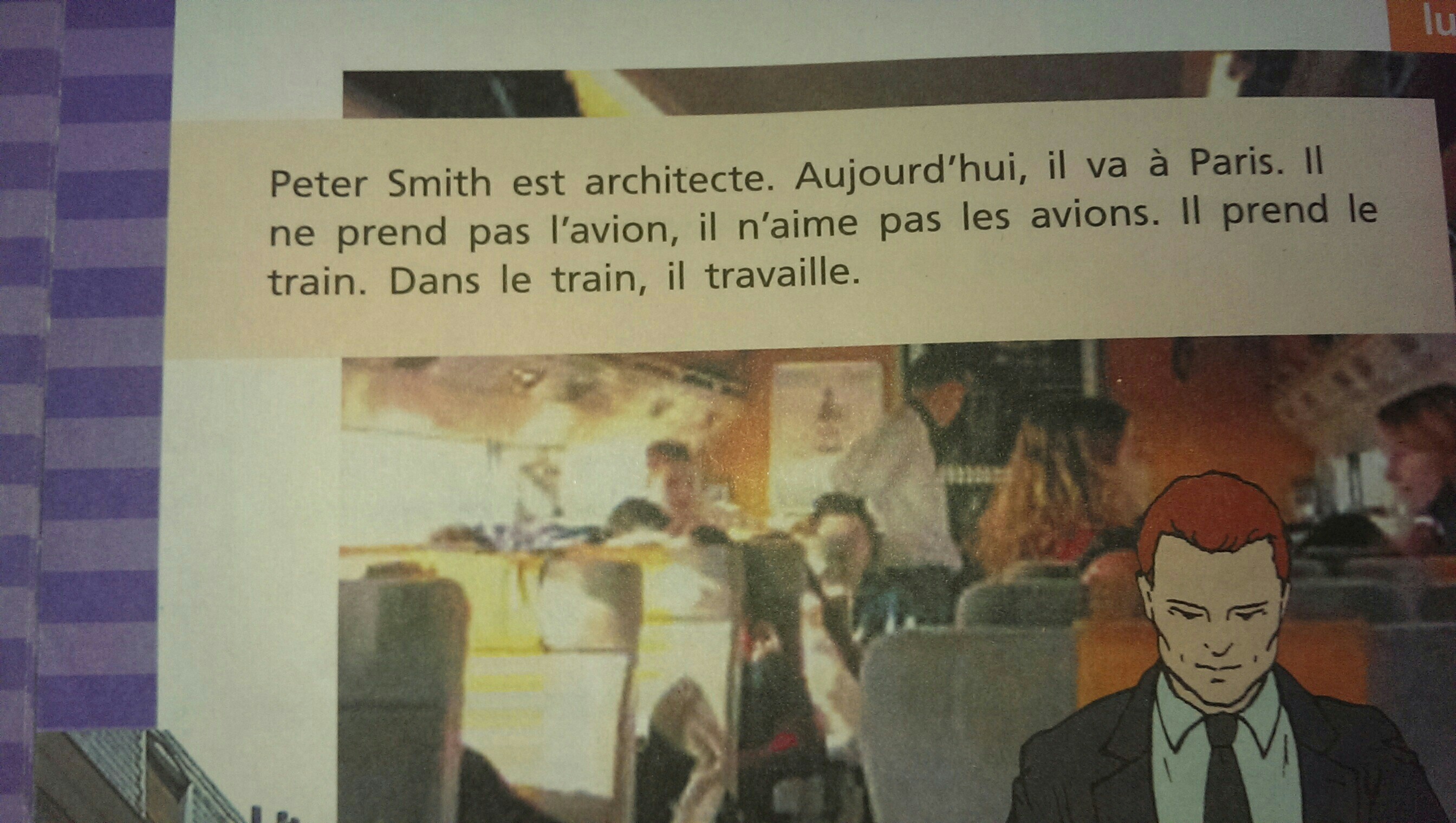 Питер Смит-архитектор. Сегодня он едет в Париж. Он не летает, ему не нравятся самолеты. Он едет на поезде. В поезде он работает.