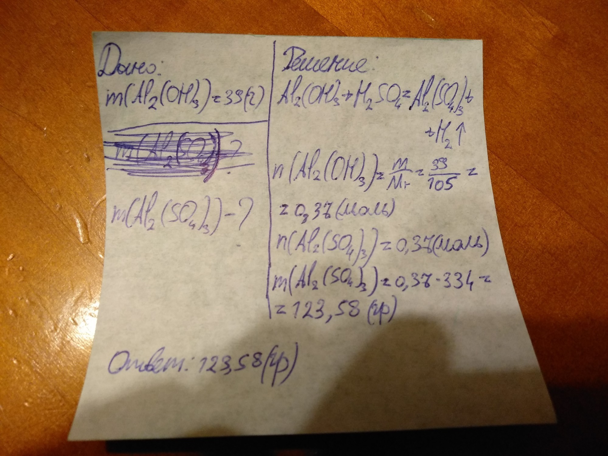 ПОМОГИТЕ ПОЖАЛУЙСТА. 1. РАССЧИТАЙТЕ, КАКАЯ МАССА СОЛИ ОБРАЗУЕТСЯ ПРИ ВЗАИМОДЕЙСТВИИ 39 Г ГИДРОКСИДА АЛЮМИНИЯ С СЕРНОЙ КИСЛОТОЙ. 2. К 240 Г РАСТВОРА С МАССОВОЙ ДОЛЕЙ ГИДРОКСИДА НАТРИЯ 10% ДОБАВИЛИ ИЗБЫТОК ХЛОРИДА ЖЕЛЕЗА (3). ОПРЕДЕЛИТЕ МАССУ ВЫПАВШЕГО ОСАДКА.