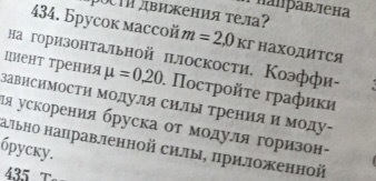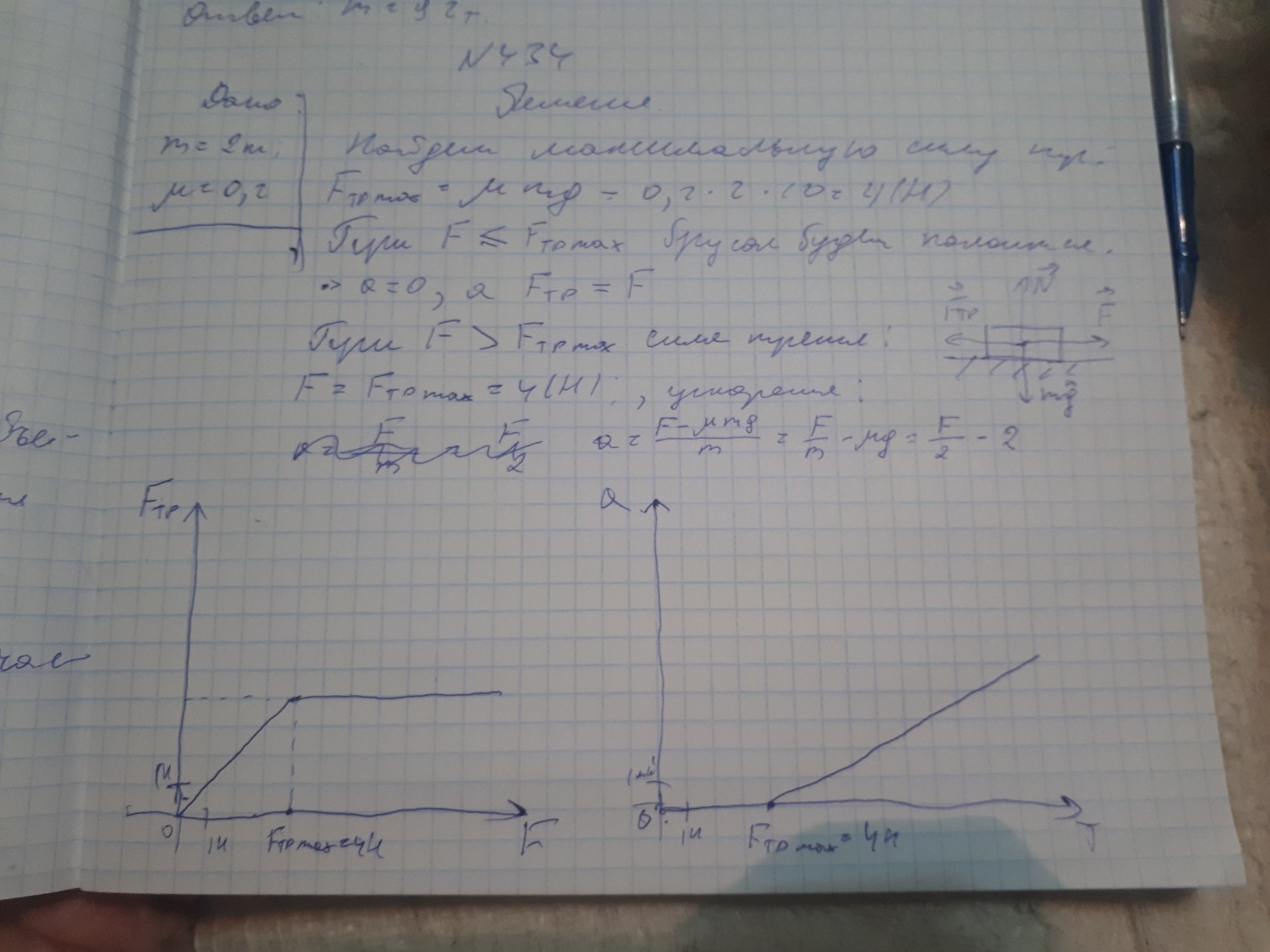 434 задача.Брусок массой m=2кг находится на горизонтальной плоскости. Коэффициент трения M=0.20. Постройте графики зависимости модуля силы трения и модуля ускорения бруска от модуля горизонтальной направленной силы, приложенной к бруску. БУДУ ОЧЕНЬ БЛАГОДАРЕН