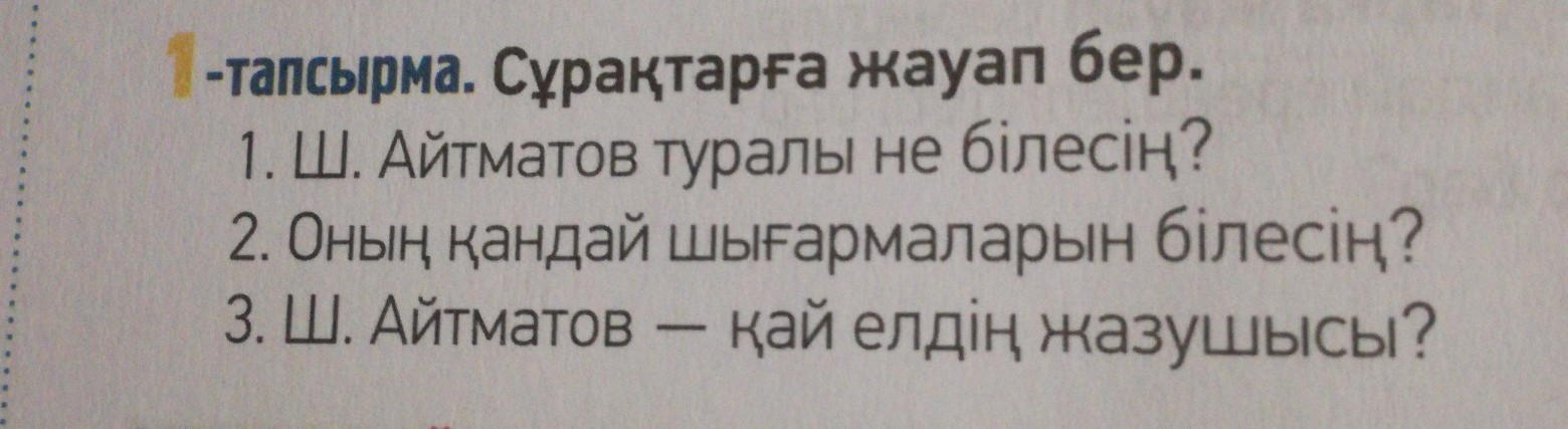 1.Шыңғыс Төреқұлұлы Айтматов (12.12.1928 жылы туған, Қырғыз Республикасы Талас өңірі, Шекер ауылы - 10.06.2008 жылы) – жазушы, қоғам және мемлекет қайраткері. Қырғызстанның халық жазушысы, Қырғызстан Ғылым Академиясының, Еуропа Ғылым Академиясының академигі, Социалистік Еңбек Ері.[1]