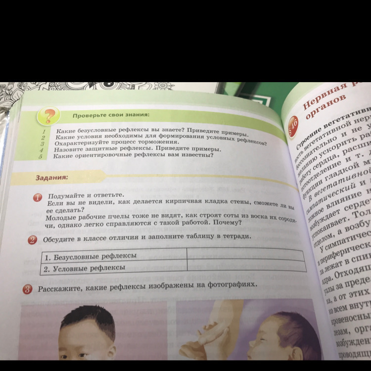 Безусловные рефлексы: слюноотделение при попадании пищи в рот, моргание, чихание, отдергивание руки от горячего предмета, ориентирование в пространстве, поворот головы в ответ на резкий звук, зажмуривание глаз при взгляде на резкий свет.