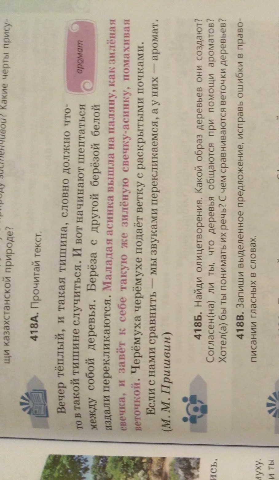 418В)моладая осинка вышла на поляну,как зеленая свечка,и зовет к себе такую же зеленую свечку-осинку,помахивая веточкой.