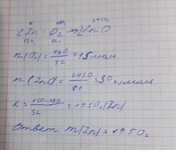 Вычисли массу цинка, прореагировавшего с 480 г кислорода, если в результате реакции образовалось 2430 г оксида цинка.