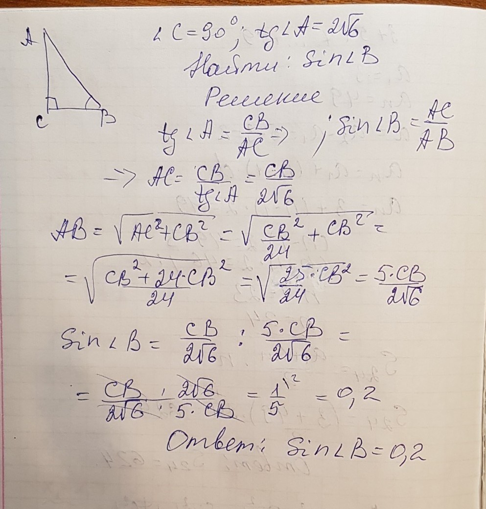 В треугольнике ABC угол С равен 90°, tg A =2√6. Найдите sin B.