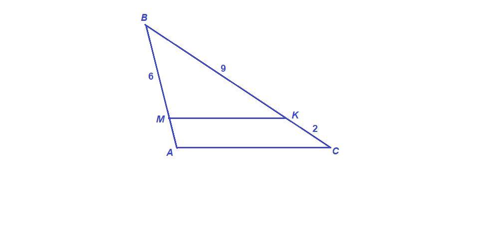 2) угол ВМК равен углу ВАС как соответственныепри МК//АС и секущей АВ