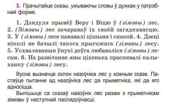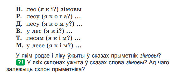 Р.лесу(якога?) зимовага; Д.лесу(якому?)зимоваму; В.у лес(яки?)зимовы; Т.лесам(яким?)зимовым; М. у лесе(яким)зимовым. Зимовы-адз.лик, м.р.