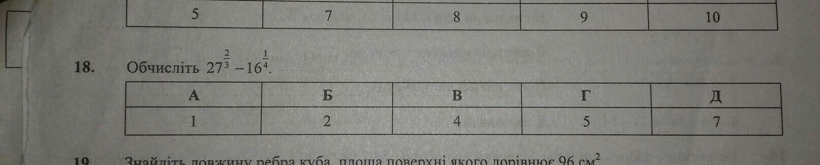 27^2/3 – 16^1/4= (3³)^2/3 –(2^4)^1/4 = 3^6/3 -2^4/4 = 3²-2=9-2=7