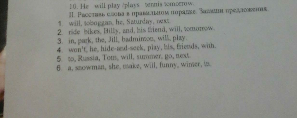 1. будет, тобогган, он, суббота, nexi 2. покататься на походах, Билли, и, его друг, будет, завтра 3. в, парк, Джилл, badrnintoa, будет, играть 4 вона, он, прятки шей, играй, его, друзья, с 5 к, россия, том, воля, самнер, давай, дальше. 6. снеговик, она, делает, будет, fuany, зима, в