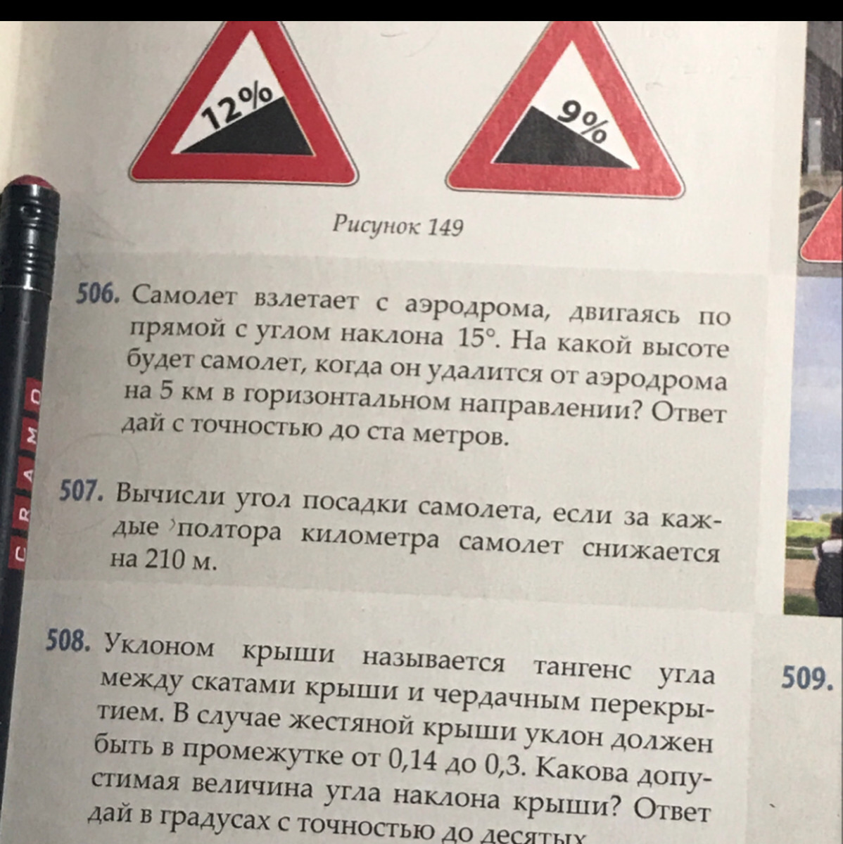 Мы знаем, что каждые 1500 метров самолет снижается на 210 метров. Тогда отношение 210/1500=0,14 будет тангенсом угла посадки. Тогда если мы возьмем arctg(0.14)=8 градусов.