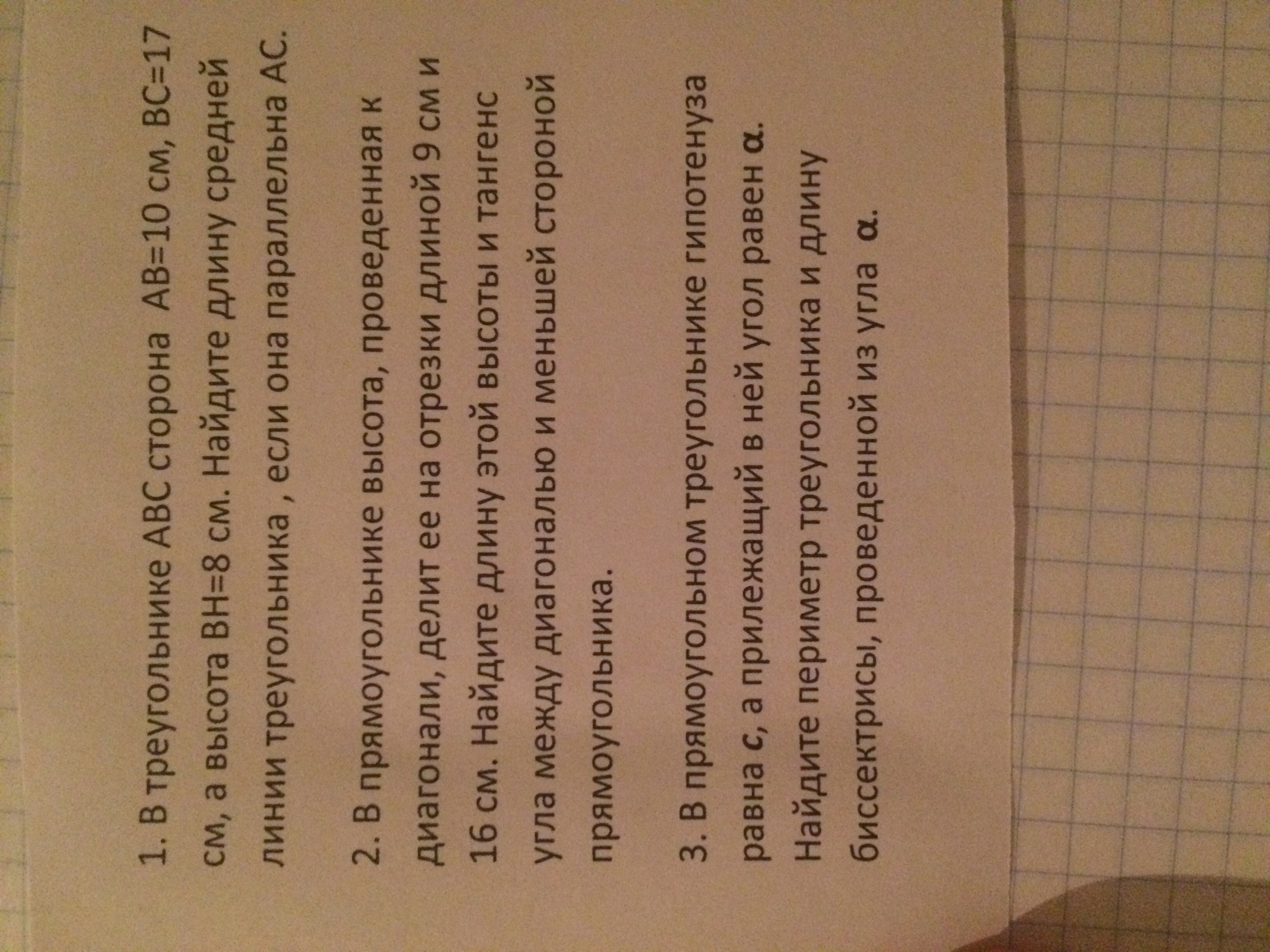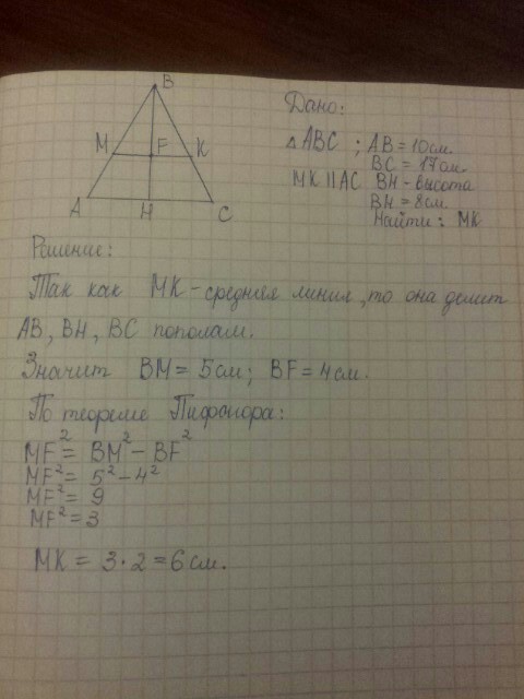 1)В треугольнике АВС сторона АВ=10 см, ВС=17 см, а высота ВН=8 см. Найдите длину средней линии треугольника, если она параллельна АС.