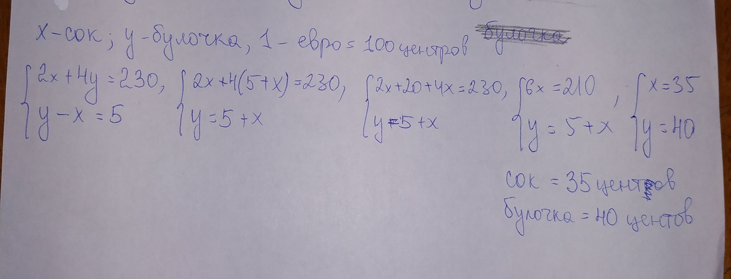 Решить можно системой. х= стоимость сока, у=стоимость булочки