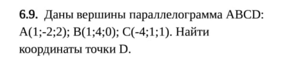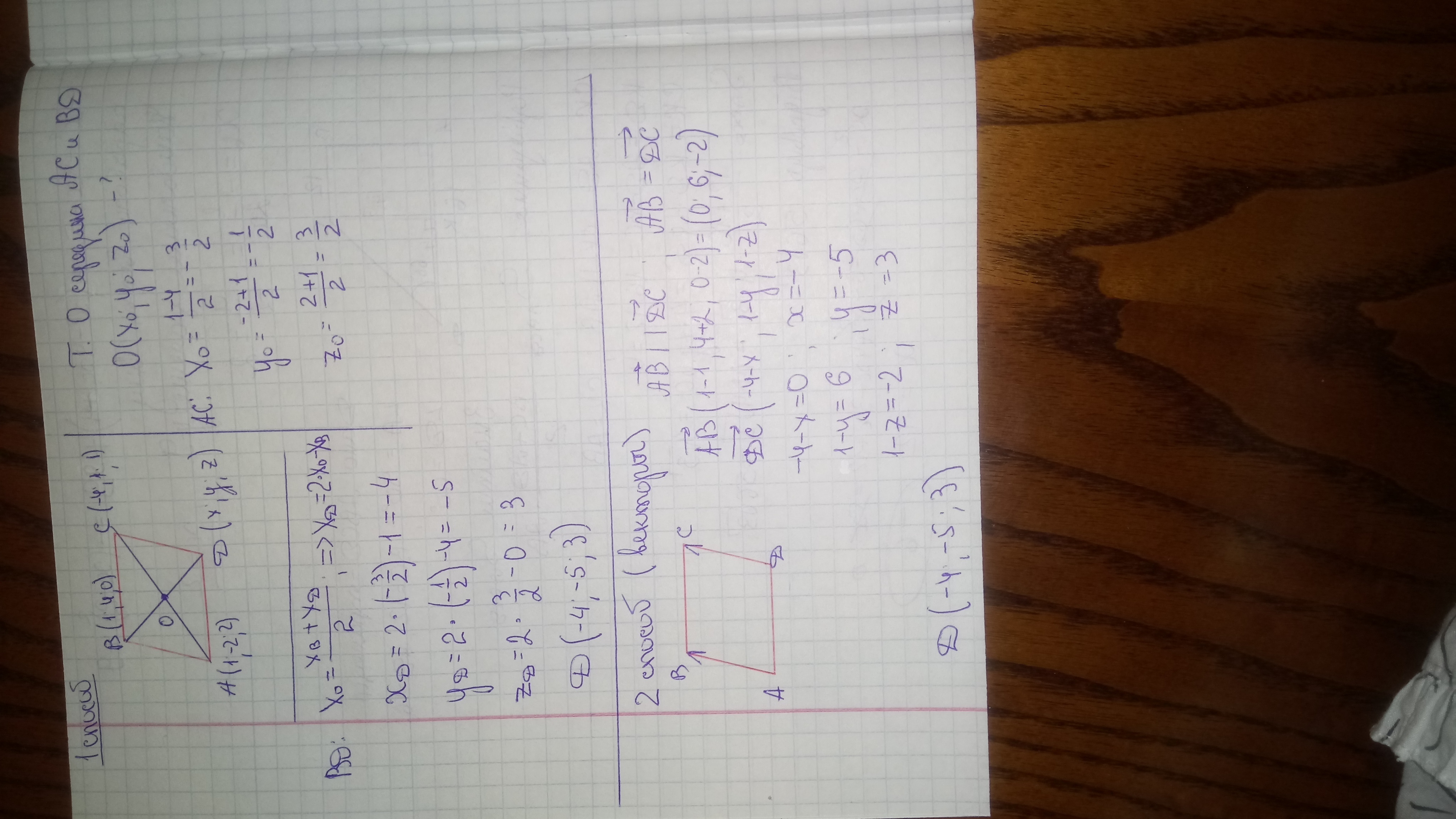 2) BC = {-4 - 1; 1 - 4; 1 - 0} = {-5; -3; 1}. Значит, координаты точки D - это смещенная по вектору BC точка A. Или (1-5; -2 - 3; 2 + 1) = (-4; -5; 3)