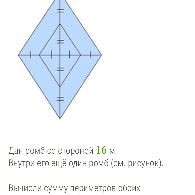 Сторона внутреннего ромба = 1/2 * 16 = 8 м (Следует из подобия треугольников)