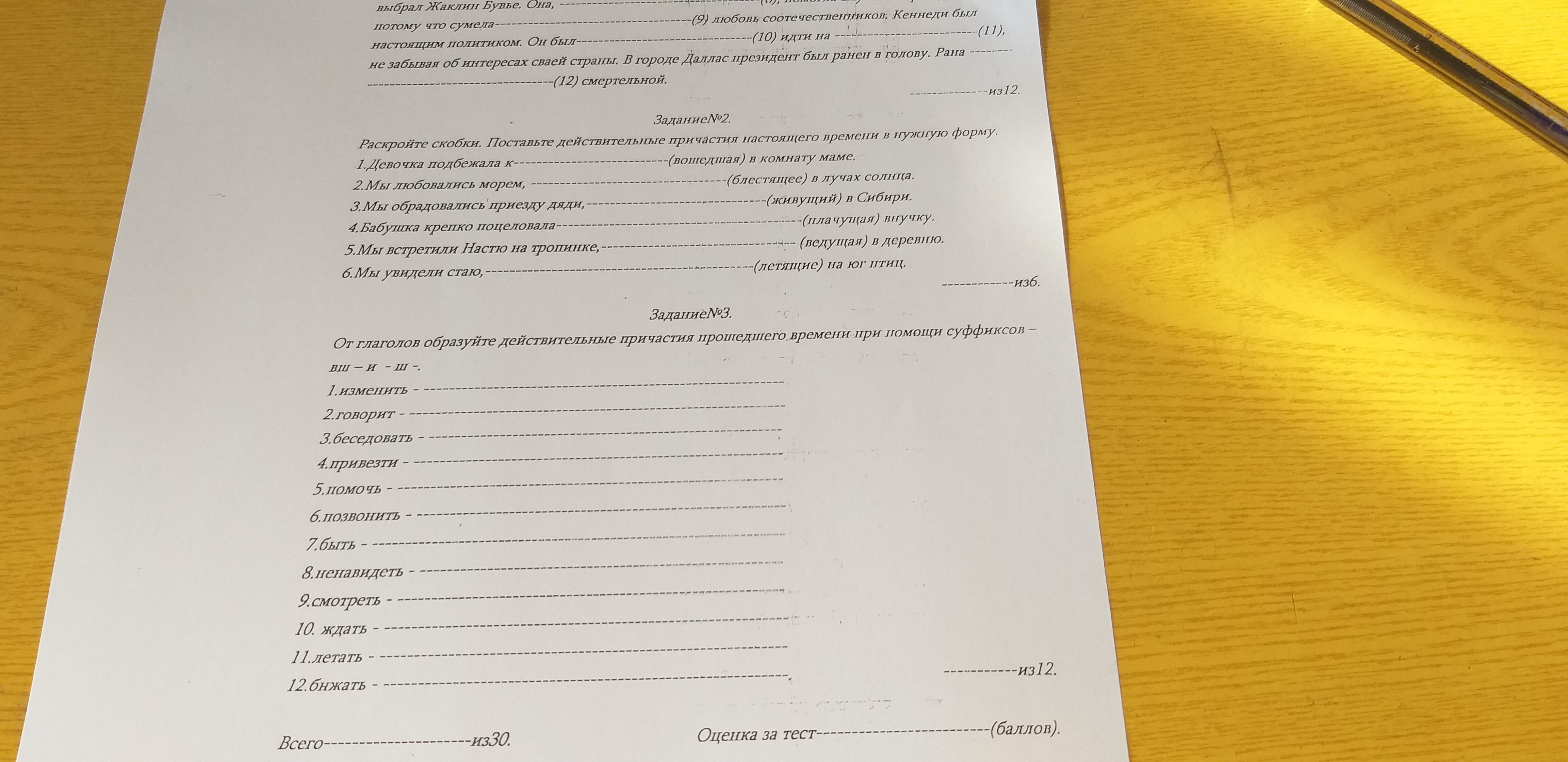1. изменить-изменивший; 2.говорит-говоривший; 3.беседовать-беседовавший; 4. привезти - привезший; 5. помочь -помогший; 6. позвонить - позвонивший; 7. быть-бывший; 8. ненавидеть-ненавидевший; 9. смотреть - смотревший; 10. ждать - ждавший; 11. летать - летавший; 12. бежать-бежавший.