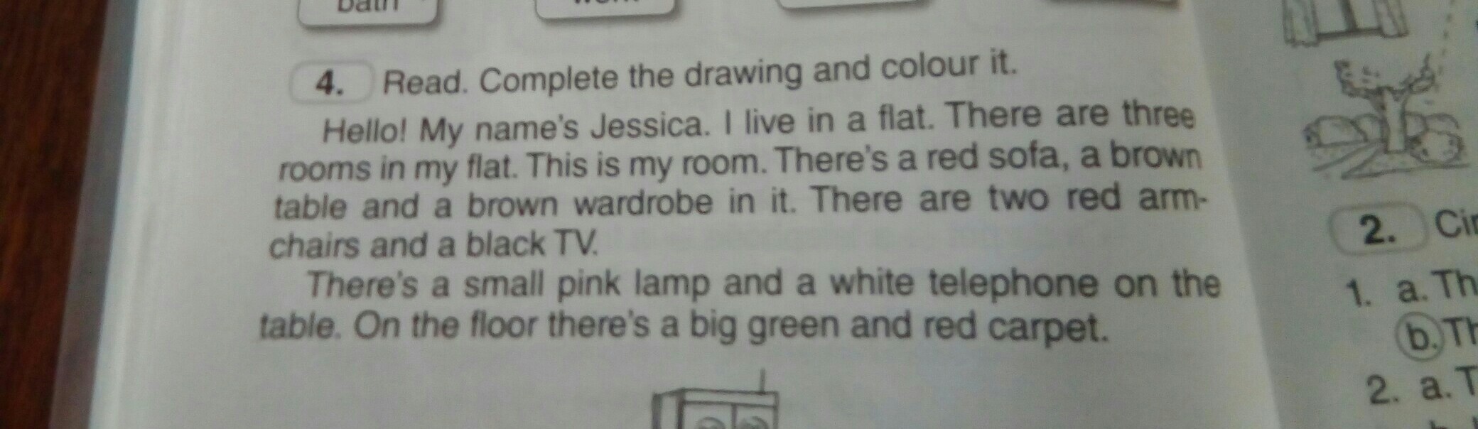 Привет! Меня зовут Джессика. Я живу с квартире. В ней 3 комнаты. Там красный диван, коричневый стол и коричневый шкаф в ней. Там два красных кресла и чёрный телевизор.