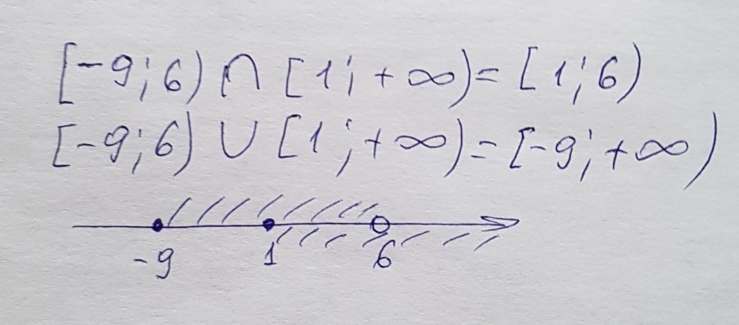 изобразите на координатной прямой и запишите пересичение и обьединение числовых промежутков [-9;6) и [1;∞)