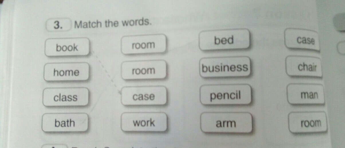 Bookcase, homework, classroom, bathroom, bedroom, business man, pencil case, armchair.