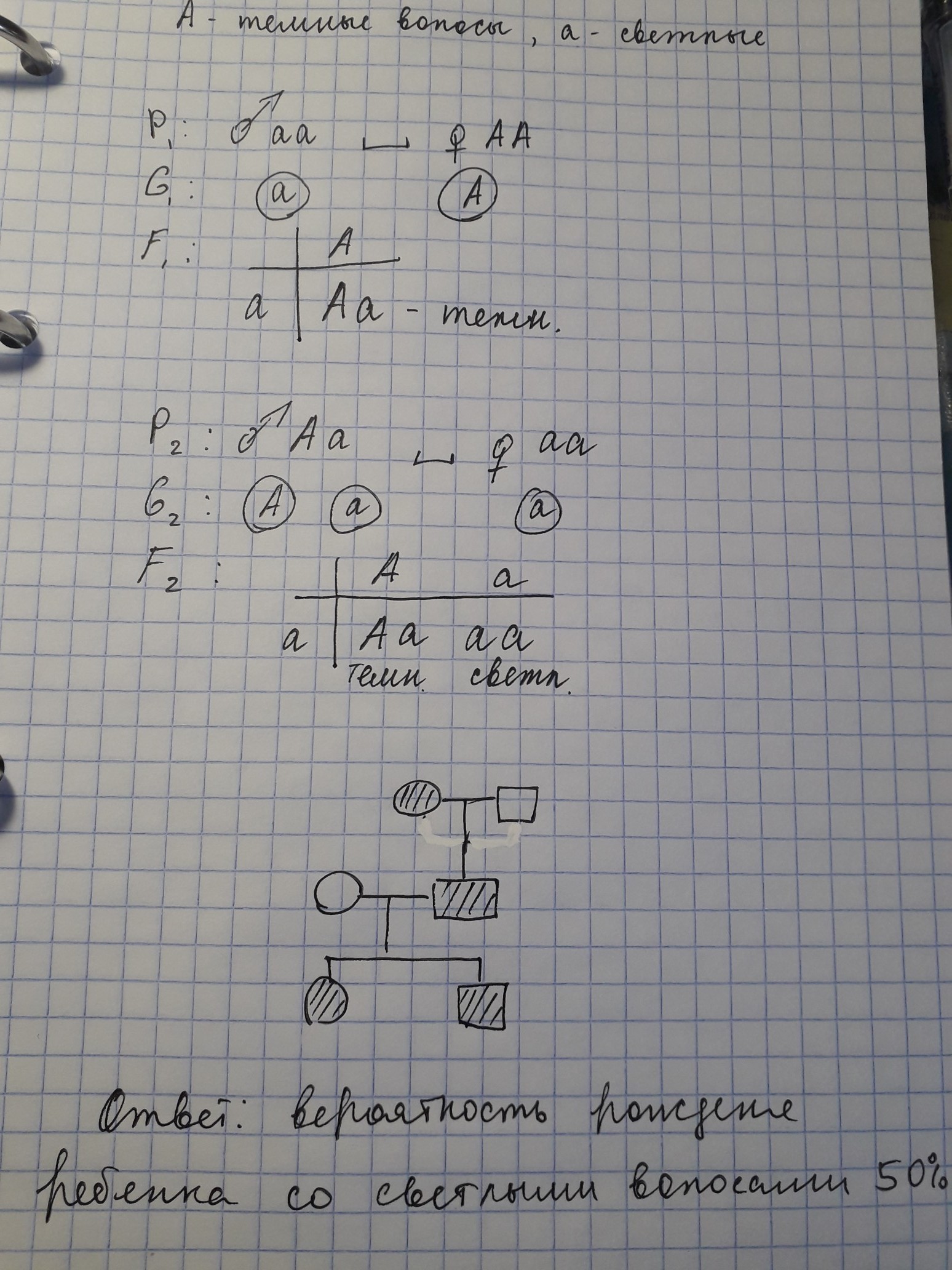 Светловолосая женщина вышла замуж за темноволосого мужчину, отец которого имел светлые волосы, а мать была брюнеткой и в её семье светловолосые не встречались. в браке родилось двое детей девочка и мальчик,оба с темными волосами. Решите задачу(с использованием решетки Пённета)и, определив генотипы всех трёх поколений, составьте схему родословной семьи. В ответе укажите вероятность рождения в этой семье ребенка со светлыми волосами.
