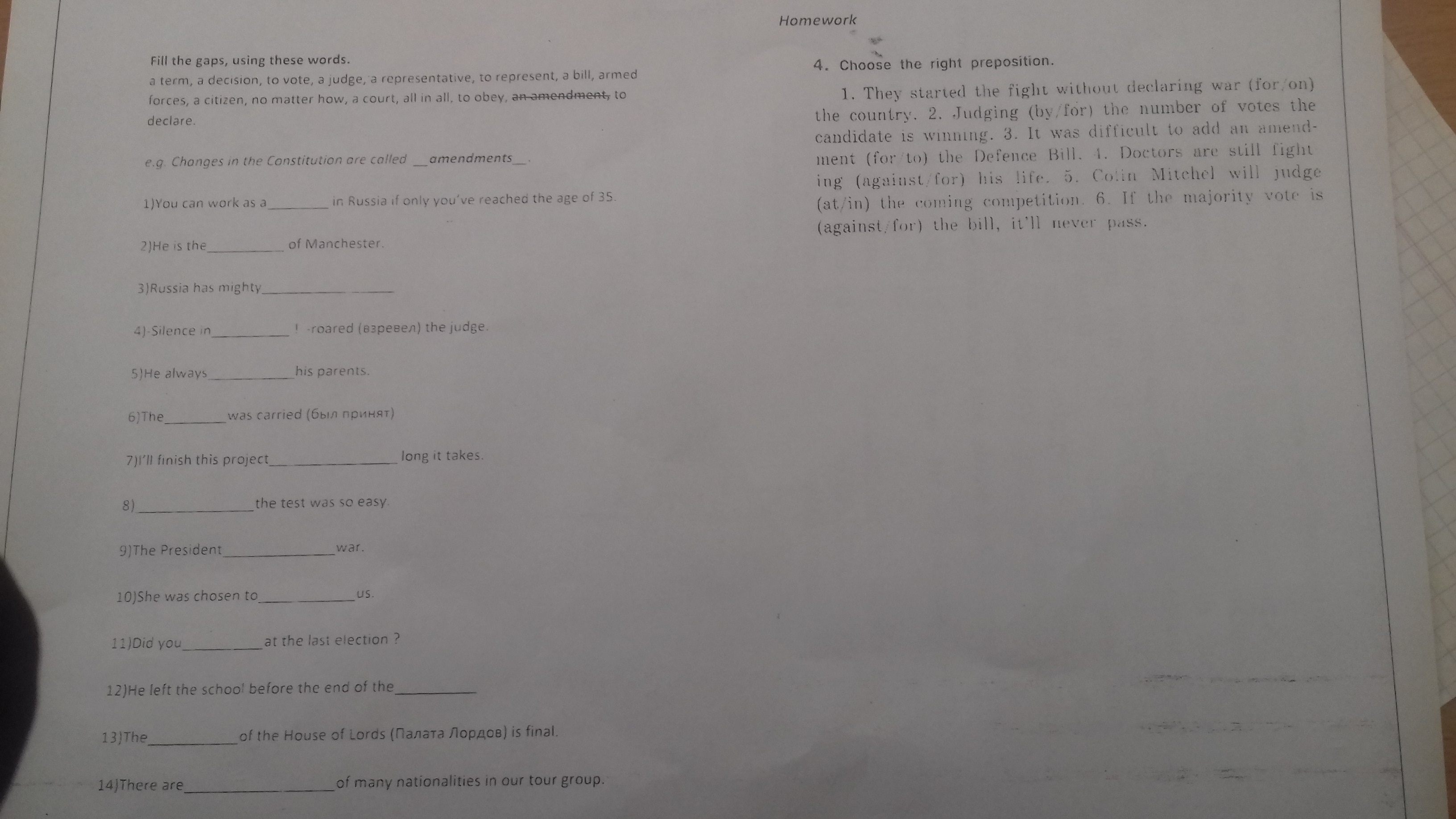 a term, a decision, to vote, a judge, a representative, to represent, a bill, armed forces, a citizen, no matter how, a court, all in all, to obey, an amendment, to declare.