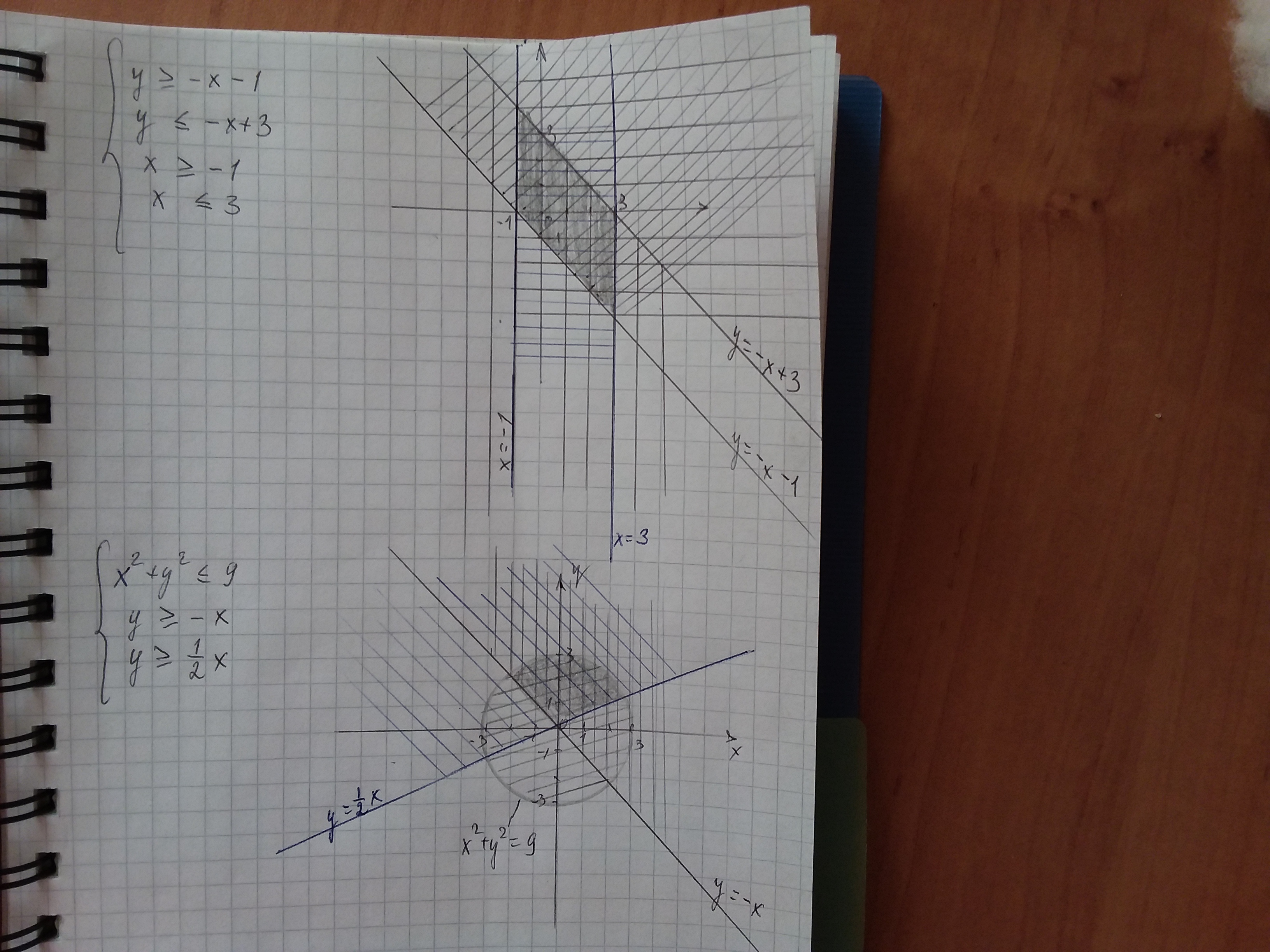 3) Окружность радиуса 3;у=-х;у=х/2.Ответ:круговой сектор,ограниченный этими линиями