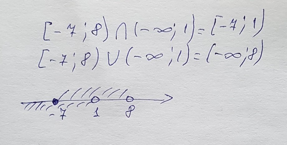 изобразите на координат ной прямой пересечение и обьеденение числовыхпромежутков [-7:8). (-бесконечность:1)