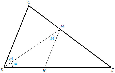 Дан треугольник CDE: угол CDE=68 градусов. DM биссектриса угла CDE. т. М лежит на стороне CE. Проведите MN//CD, т.N-на стороне DE. Выделите треугольник DMN и найдите его углы: угол MDN, угол DNM, угол NMD