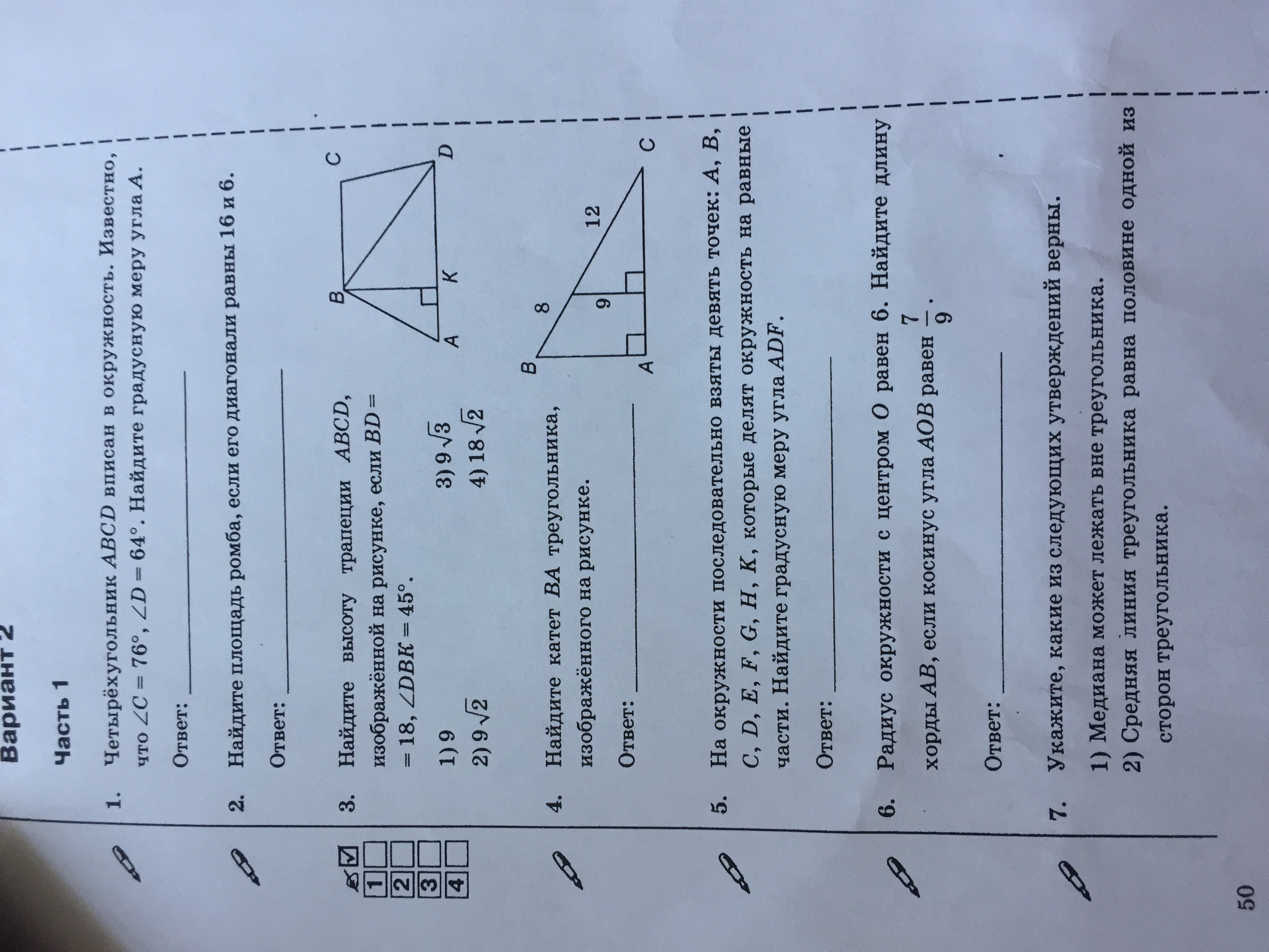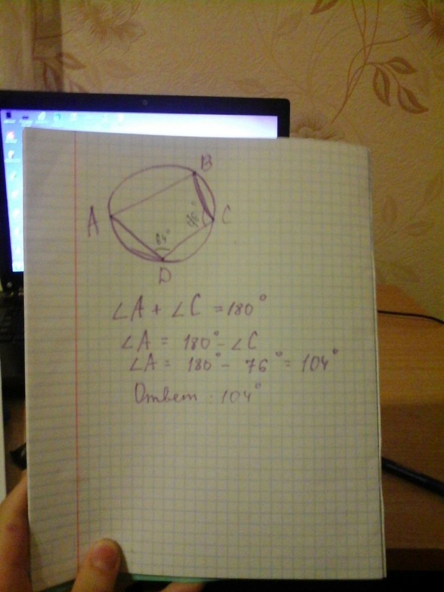 5. Окружность разделена точками А,В,С и D на отрезки (дуги) с градусной величиной 60°, 80°, 100° и 120° , то есть дуга АВ = 60°, ВС = 80°, CD = 100° и DA=120°. (так как 3+4+5+6=18, 360°/18=20°, ну и 20*3=60° и так далее...)Углы, вписанные в окружность, опирающиеся на соответствующие дуги, равны половине их градусной величины.Значит угол ВСD = (BA+AD)/2 = 180°/2=90°угол АВС = (AD+DC)/2 = 220°/2=110°. Тогда угол МСВ = 90°(как смежный с 90°) а угол МВС = 70° (как смежный с 110°) (точка М - точка пересечения прямых АВ и CD) Тогда искомый угол ВМС = 180°-90°-70° =20°. (так как в треугольнике сумма углов = 180°)Ответ 20°