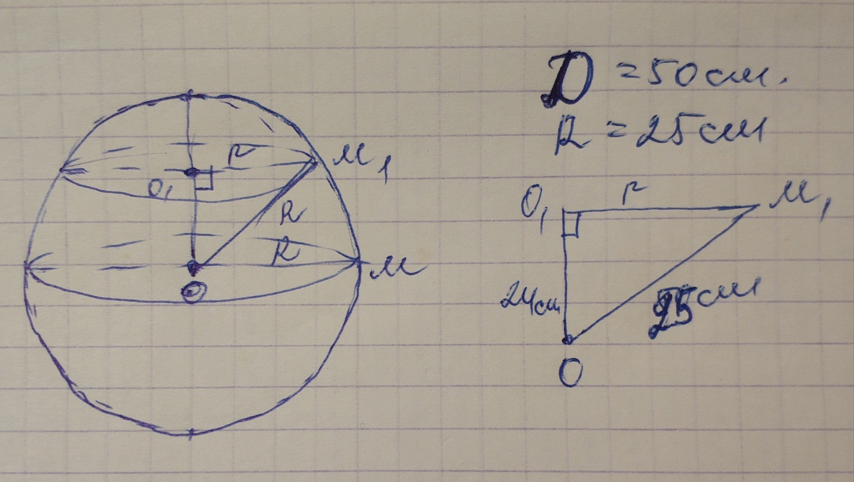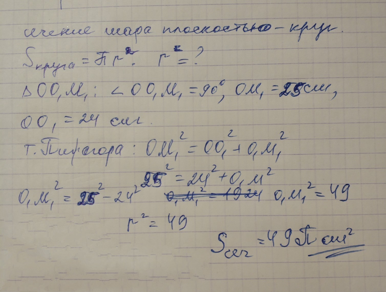 Кулю, діаметр якої дорівнює 50 см, перетнуто площиною на відстані 24 см від центра кулі. Знайти площу перерізу.