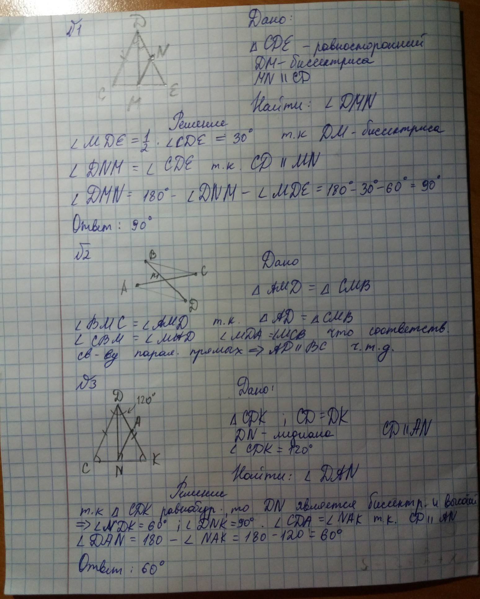 решите плес с "дано,найти там,решение" 70 баллов. 1.Отрезок DM-биссектриса равностороннего ▲CDE.Через точку M проведена прямая ,параллельная стороне CD и пересекающая сторону DE в точке N.Найдите углы ▲DMN. 2.Отрезки AC и BD пересекаются в точке M,причём ▲AMD=▲CMB.Докажите,что AB параллельна DC. 3.В равнобедренном ▲CDK CD=DK,проведена медиана DN.Через точку N проведена прямая NA параллельна CD.Найдите углы ▲DAN,если угол CDK=120 градусов.
