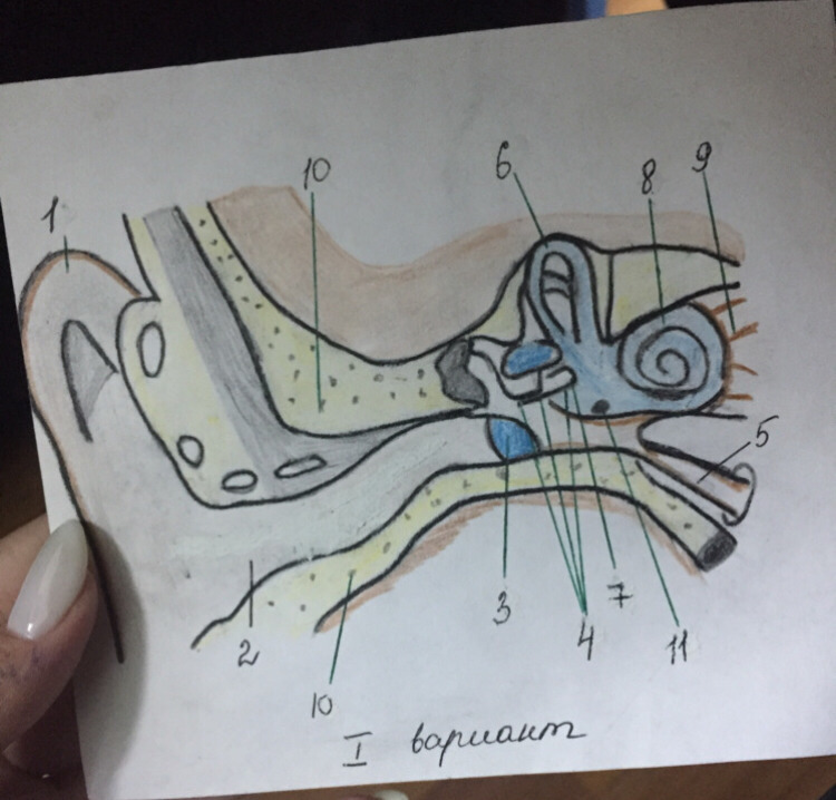 1. Ушная раковина. 2. Слуховой канал 3. Барабанная перепонка 4. Слуховые косточки 5. Евстахиева труба 6. Полукружные каналы 7. Сферический мешочек 8. Улитка 9. Нерв