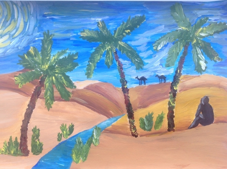Я выбрала этот отрывок, так как по моему мнению, он лучше всего подходит для того, что бы описать пустыню, в которой происходят все эти действия. Я выбрала ярко желтые и зеленые оттенки, так как по сколько мы знаем, что действия происходит в пустыне, а яркие цвета лучше всего подходят для изображения этого пейзажа. Мне кажется, что выбранная мной цветовая гамма, как будто помогает смотрителю, так сказать окунуться в действия которые описываются в стихотворении.