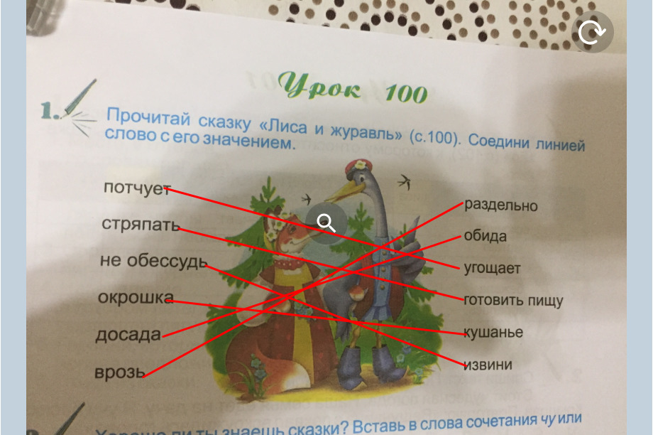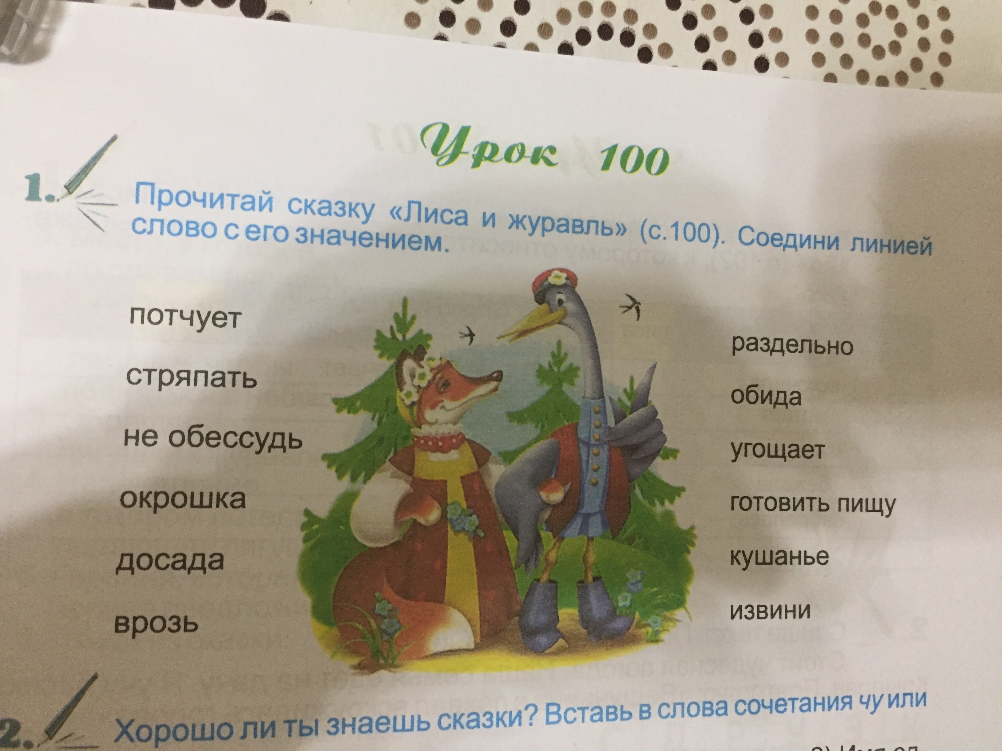 Прочитай сказка Лиса и журавль. Соедини линией слова с его значением. Подчует.стряпать.не обессудь.окрошка.досада.врозь.