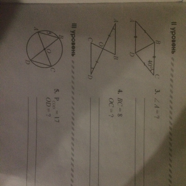 4)треугольники имеют одинаковые стороны AO и OD и по два одинаковых угла( углы A и D, противоположные углы по точке O) соответсвенно треугольники AOB и COD равны, тогда OC=BC/2=8/2=4