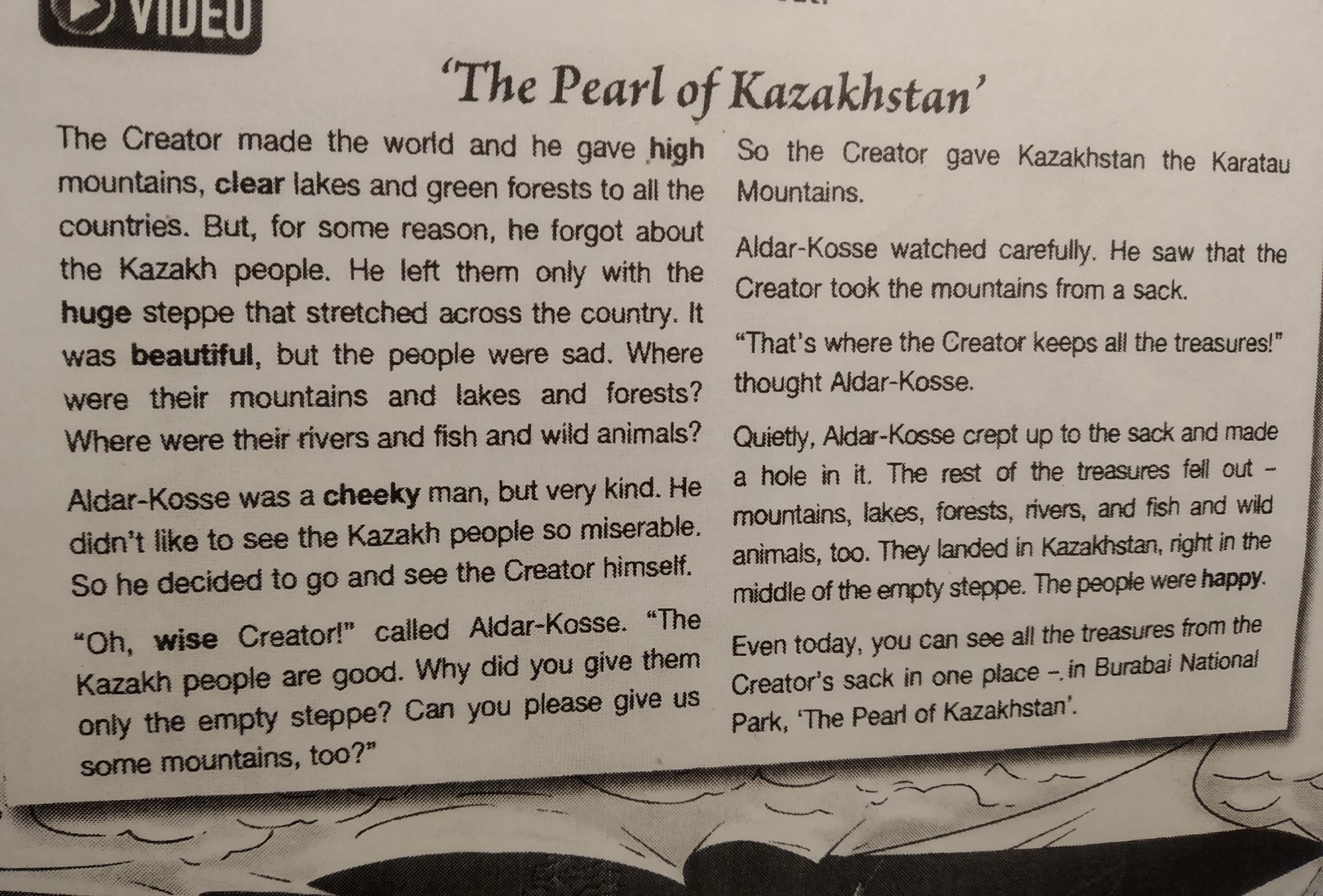 Творец создал мир и дал высокие горы, прозрачные озера и зеленые леса всем странам. Но, по некоторым причинам, он забыл про Казахских людей. Он оставил их с огромной степью, которая расстянулась по всей стране. Она была красива, но люди были грустными. Где же были их горы, озера и леса? Где были их реки, рыбы и дикие животные?