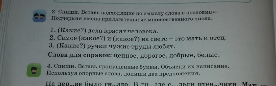 1.Добрые дела красят человека. 2.Самое ценное и дорогое на свете-это мать и отец. 3.Белые ручки чужие труды любят. Добрые,белые-имена прилаг.во множественном числе.