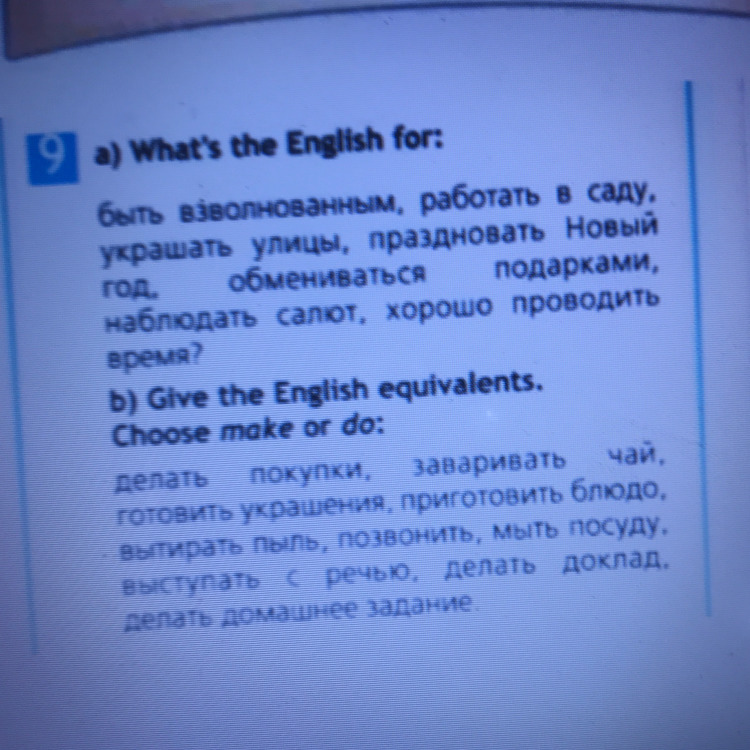 go shopping, to make tea, to prepare decorations, to make a dish, to dust, to call, to wash the dishes,to make a speech, to make a report, to do homework