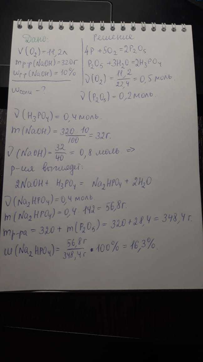 Для окисления фосфора израсходовано 11.2л(н.у.) кислорода. Полученный фосфорный ангидрид растворили в 320г 10%-ного раствора едкого натра. Определите массовую долю (%) образовавшейся соли.