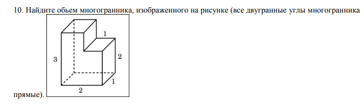 Найдите обьем многогранника, изображенного на рисунке (все двугранные углы многогранника