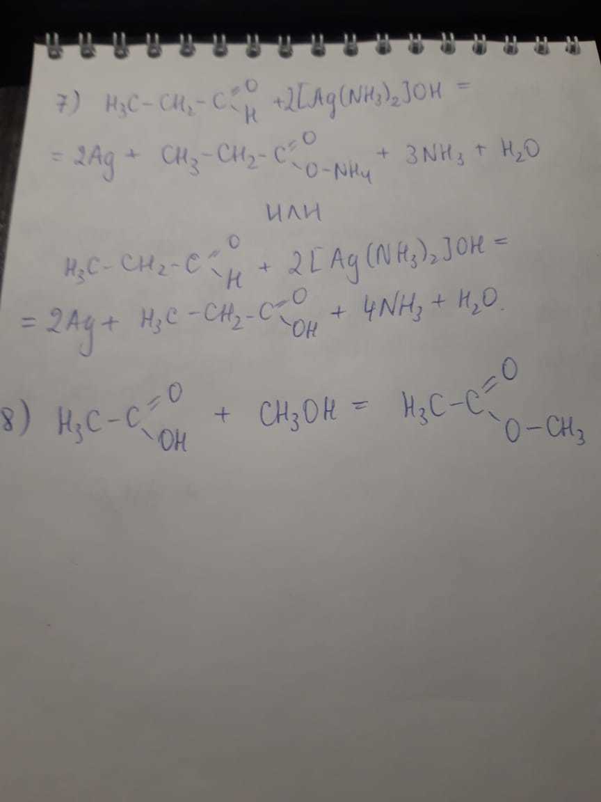 7) CH₃-CH₂-CHO + 2[Ag(NH₃)₂]OH = 2Ag + CH₃-CH₂-COONH₄ + 3NH₃ + H₂O