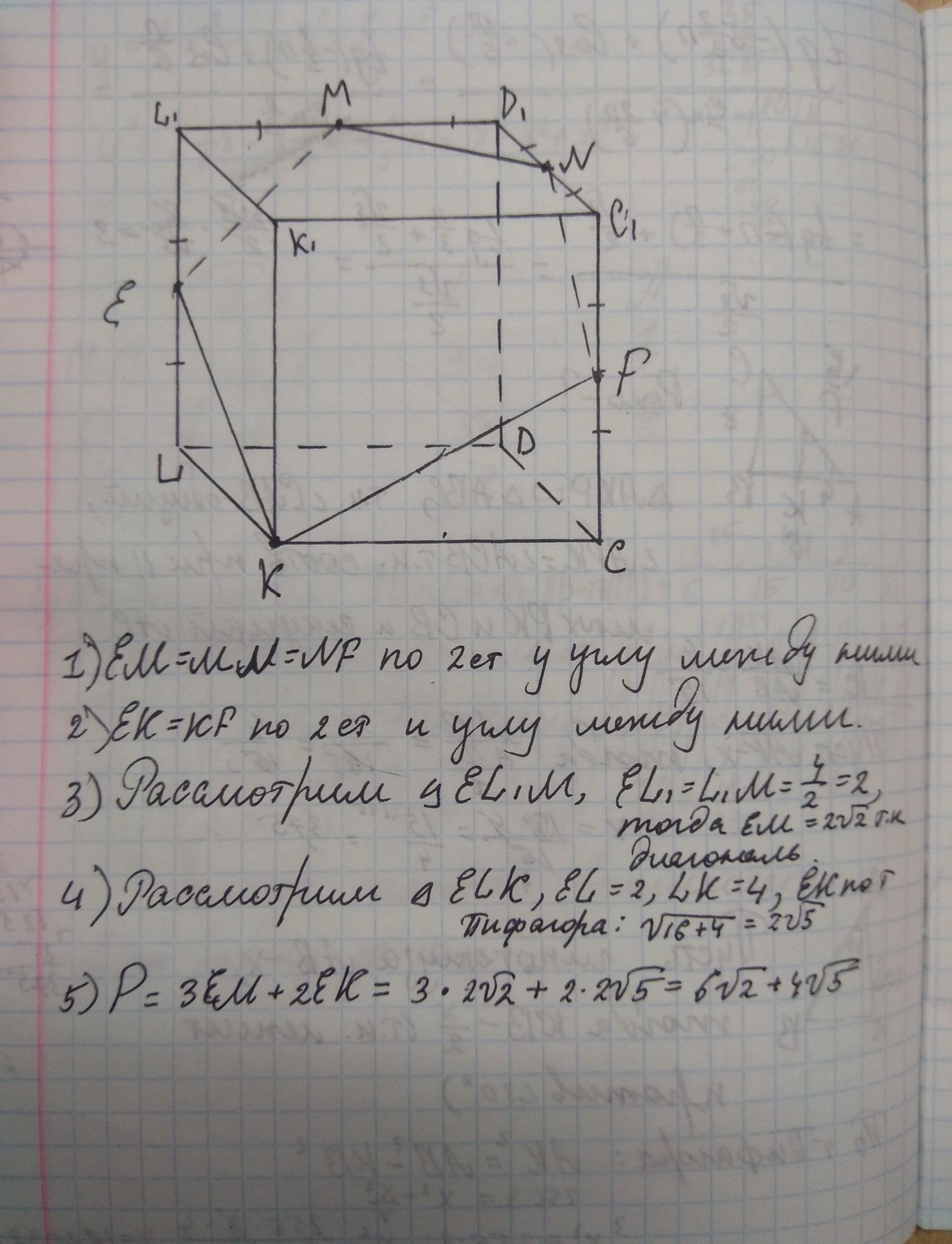Постройте сечение куба KLDCK1L1D1C1 плоскостью, которая проходит через точки K, M, N, где M и N - середины ребер L1D1 и D1C1. Найдите периметр сечения, если ребро куба - 4 см.