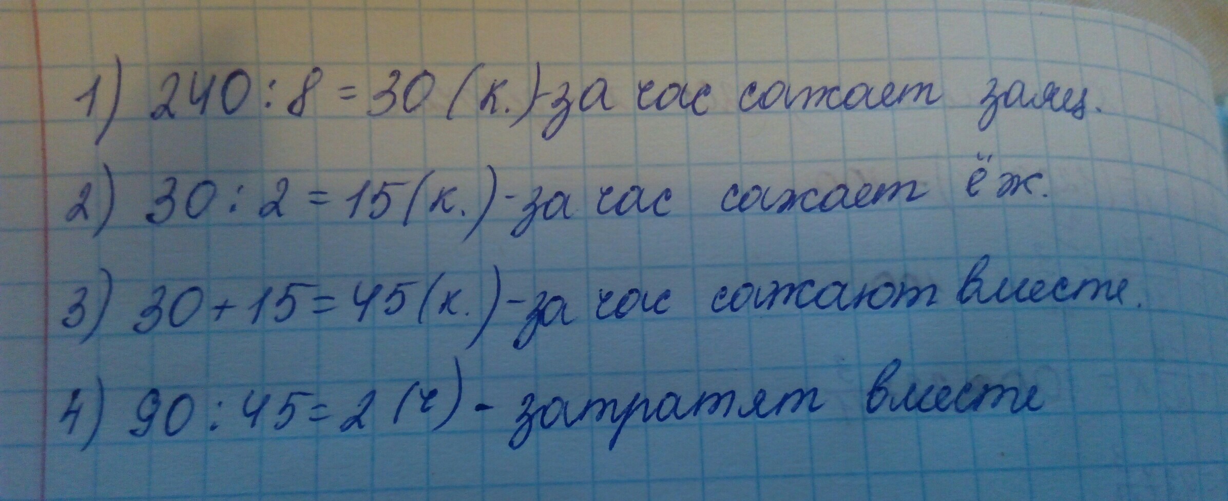 Заяц и Еж решили посадить капусту заяц работал 8 часов и посадил 240 кустиков рассады еж работал в два раза медленнее на следующий день им надо было посадить оставшиеся 90 кустиков сколько часов они затратит работая вместе с той же скоростью