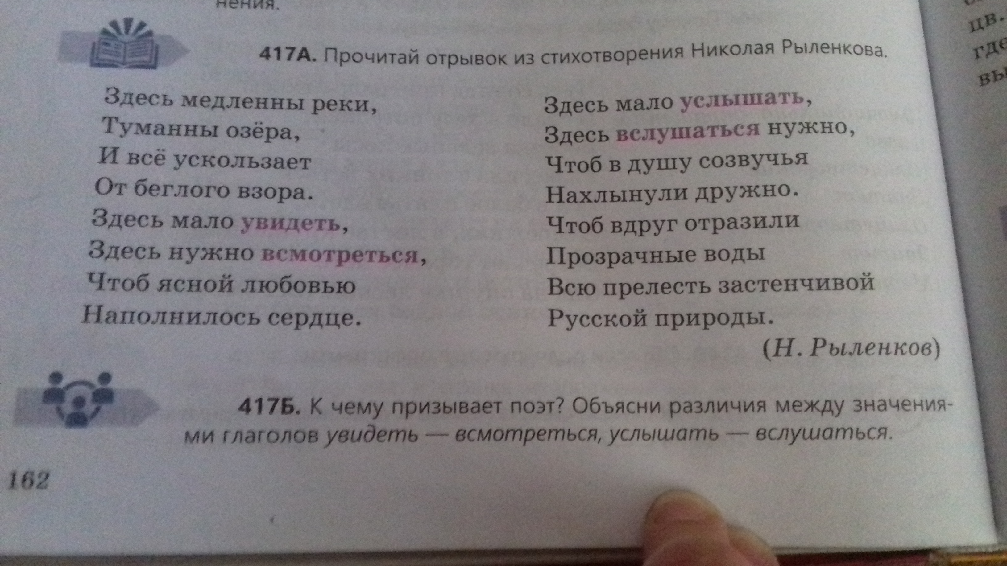 Здравствуйте Не могу понять Чем отличаются глаголы увидеть и всмотреться услышать вслушаться Помогите пожалуйста 417 б это к стиху задание на втором фото продолжение 417 б