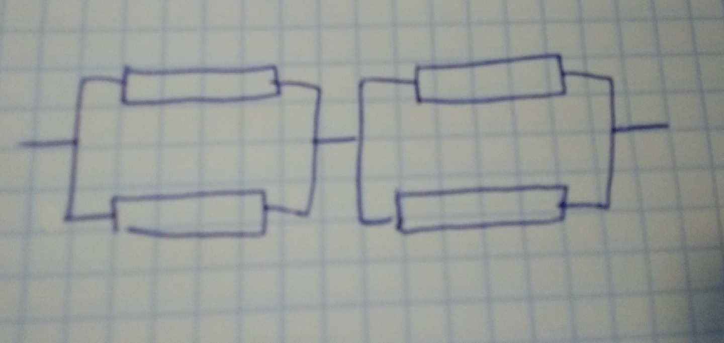 Rобщ=4*4/(4+4)+4*4/(4+4)=2+2=4 Ом
