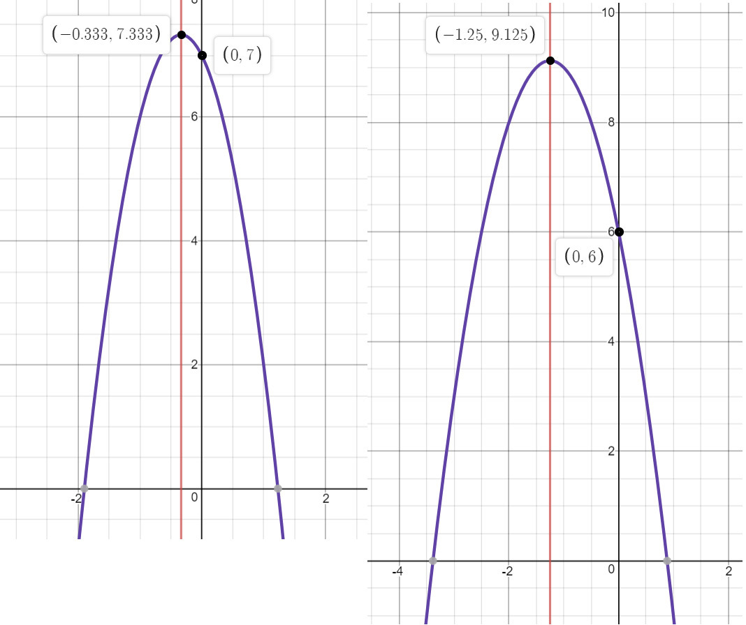 Это парабола, которая направлена вниз, координаты вершины (-1/3;7(1/3)), ось симметрии соответственно это x=-1/3, найдём точки пересечения с осями: