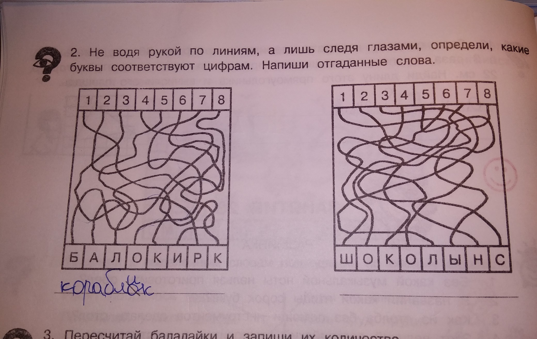 не водя рукой По линиям , А лишь следя глазами, определи, какие буквы соответствуют цифрам. Напиши отгаданные слова.