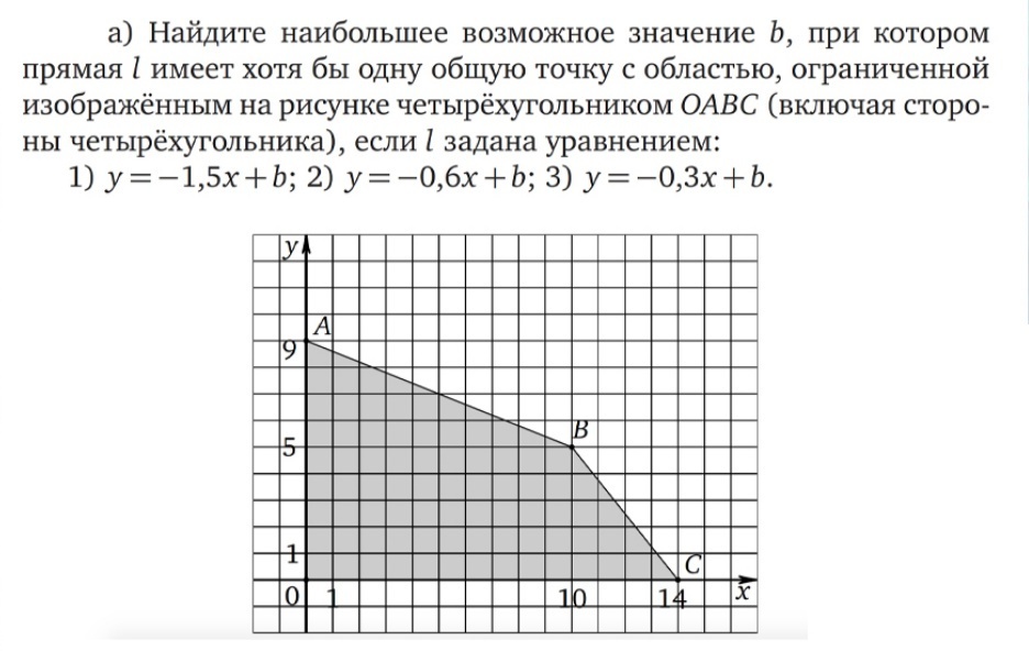 1) сравним модули угловых коэффициентов прямой АВ, прямой ВС и заданной прямой у = -1,5х + b. 1,5 > 2/5 и 1.5 > 5/4, поэтому искомая прямая будет касаться заштрихованной области в точке С(14; 0)