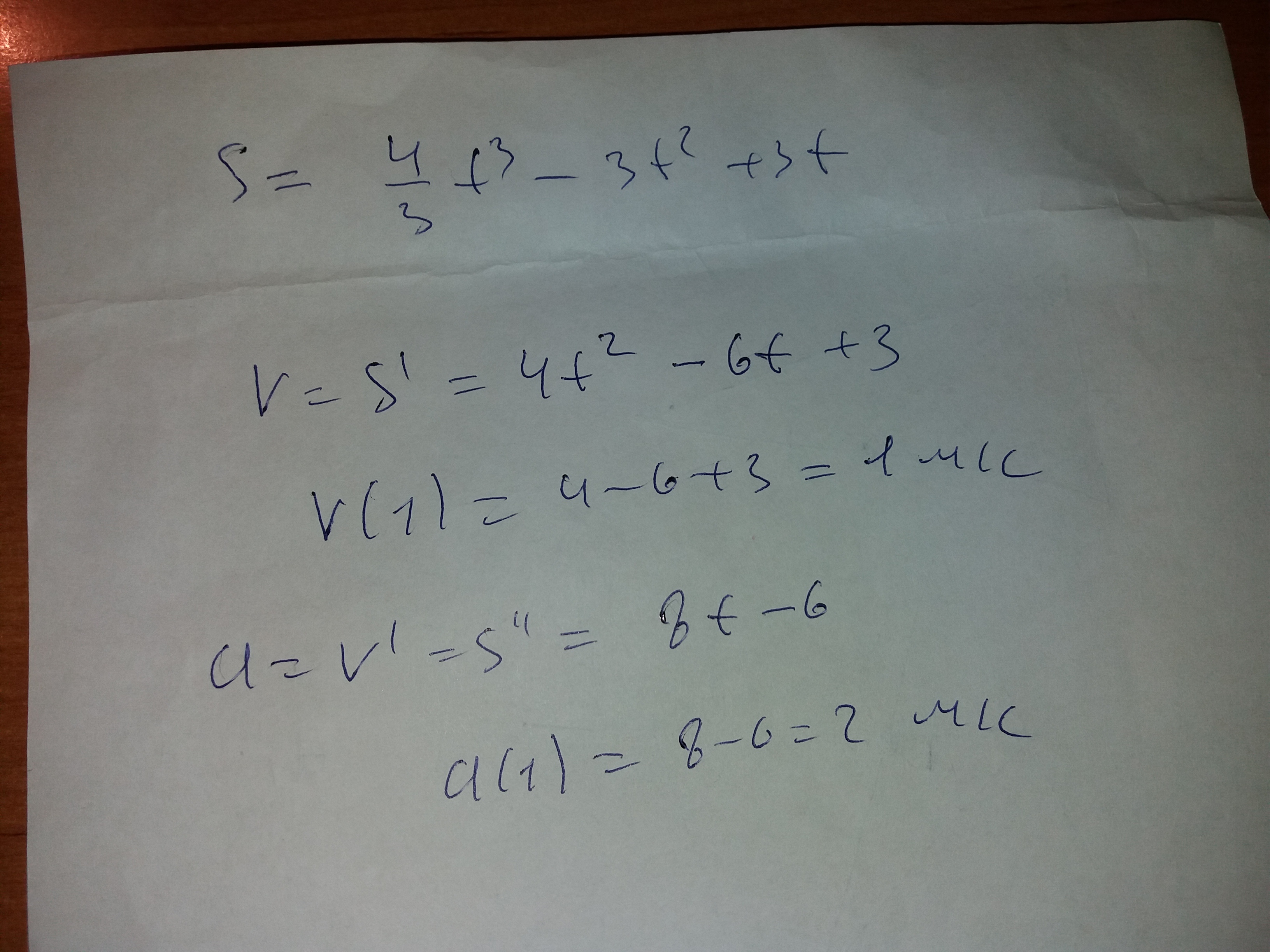 Ответ: Скорость ищем как производную от пути v(t)=4*t²-6*t+3, v(t=1)=4-6+3=4-3=1 м/с. Ускорение ищем как производную от скорости